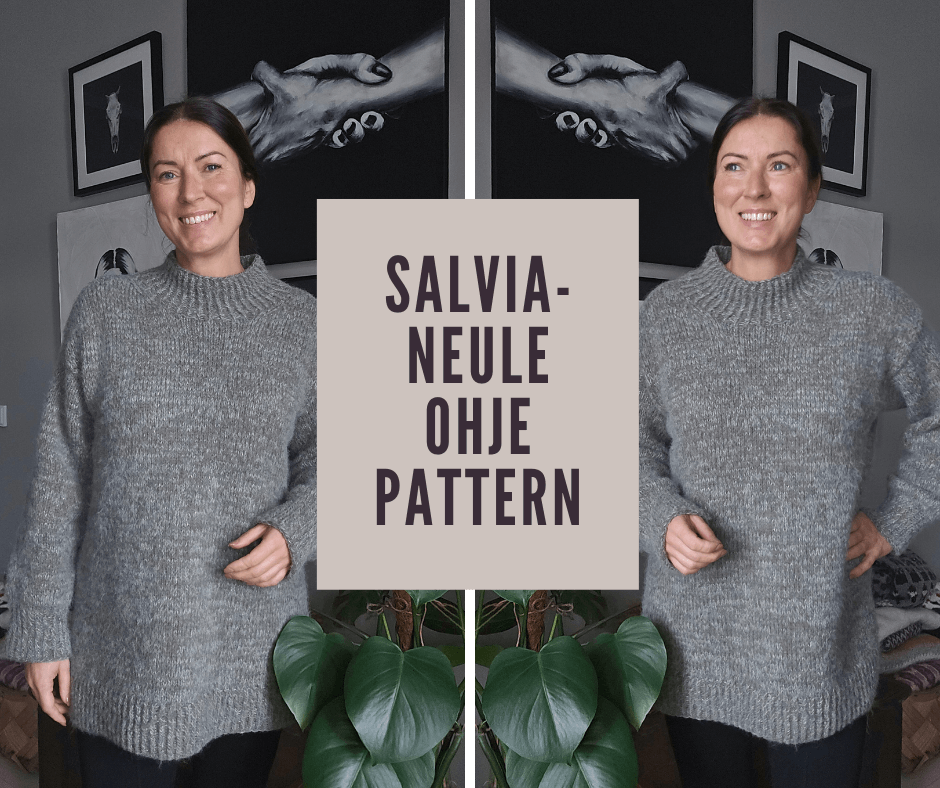 Body is worked in the round from bottom up until the underarms where back and fronts are separated. Back and the fronts are all knit flat separately and shoulders are seamed. Sleeve stitches are picked up and knit from the edges of the armhole and sleeves are knit in the round towards the wrist. Stitches are picked up from the neckline partly from holder, partly in knitting. The sweater is oversized and has a significant amount of positive ease. For myself I knit a size with 20 cm (7.8”) ease at the bust circumference.
